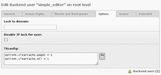 Then setting these values in the TSconfig field of the user himself, would override the default value of the header (marked red) and add the clear cache option (marked blue). The default value of the hidden field is not changed and simply inherited directly from the group: