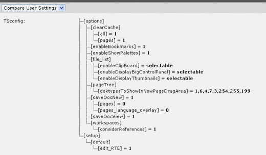 setup.default setup.override | ->SETUP | Default values and override values for the user settings known from the setup module. Notice: There is a tricky aspect to these settings; If first you have set a value by setup.override and then removes it again you will experience that the value persists to exist. This is because it is saved in the backend users profile. Therefore, if you have once set a value, do not remove it again by rather set it blank if you want to disable the effect again! | |