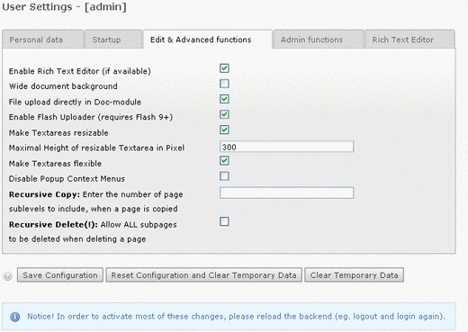 alertPopups | bitmask | Configure which Javascript popup alerts have to be displayed and which not: 1 – onTypeChange 2 – copy / move / paste 4 - delete 8 – FE editing 128 - other (not used yet) | 255 (show all warnings) |