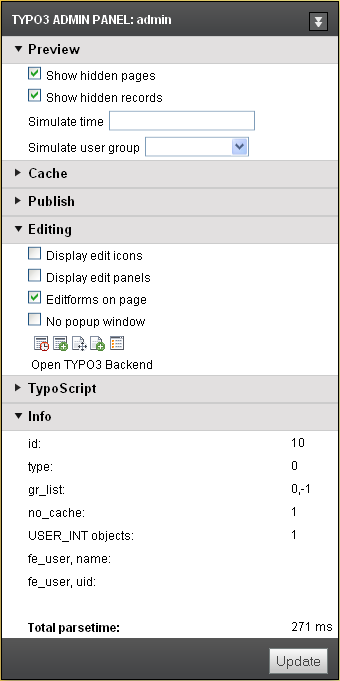 override | [object] | Override all admin panel settings: .[modulename].[propertyname] Note: You have to activate a module first by setting .modulename = 1 Full reference: To find out the name of a modulename/property, you can have a look at the HTML code of the admin panel and watch the names of the form elements. In this example, the module name is "tsdebug", and the property is called "displayTimes": name="TSFE_ADMIN_PANEL[tsdebug_displayTimes]" Most common options .preview.showHiddenPages (boolean) .preview.showHiddenRecords (boolean) .preview.simulateDate (timestamp) .preview.simulateUserGroup (integer) .cache.noCache (boolean) .cache.clearCacheLevels (integer) .edit.displayFieldIcons (boolean) .edit.displayIcons (boolean) .edit.editFormsOnPage (boolean) .edit.editNoPopup (boolean) | |